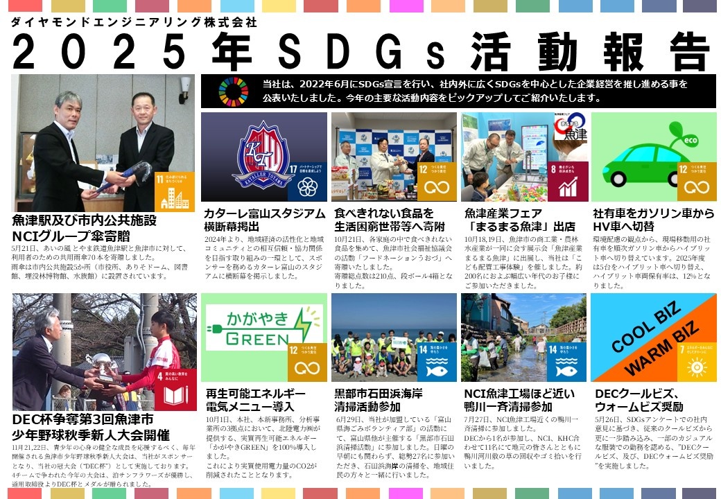 一覧へ戻る 2025年 SDGsへの当社の取り組み2026-01-15[活動報告]SDGsダイヤモンドエンジニアリング株式会社は、2025年もSDGsの目標達成に向けた活動を積極的に進めてまいりました。
